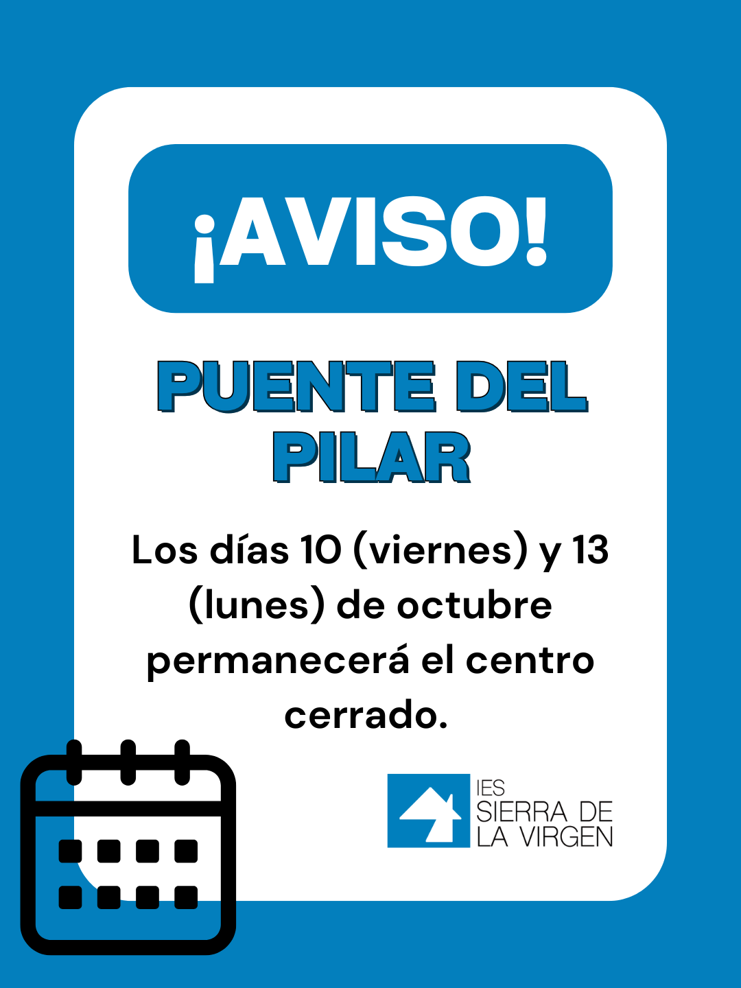 Los días 10 (viernes) y 13 (lunes) de octubre permanecerá el centro cerrado. ¡Esperamos que disfrutéis de los días libres!